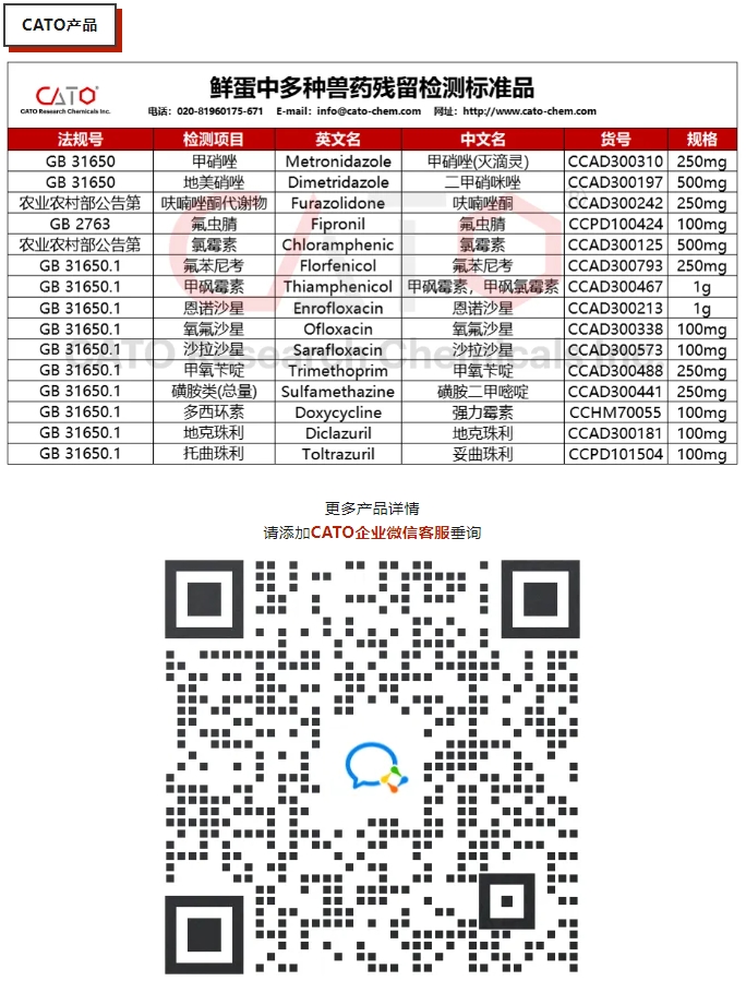 除了以上三种兽药,鲜蛋中还可能存在多种其他兽药残留。兽药在禽畜养殖过程中虽然能起到一定的疾病预防和治疗作用,但如果滥用、超量或者在休药期内使用,就很容易在畜禽产品中残留,危及消费者健康。因此,必须严格遵守兽药使用规范,加强养殖过程管控,严把兽药残留检测关,切实保障食品安全。CATO提供配套检测标准品,协同构建食品生产、流通和餐饮安全防线。